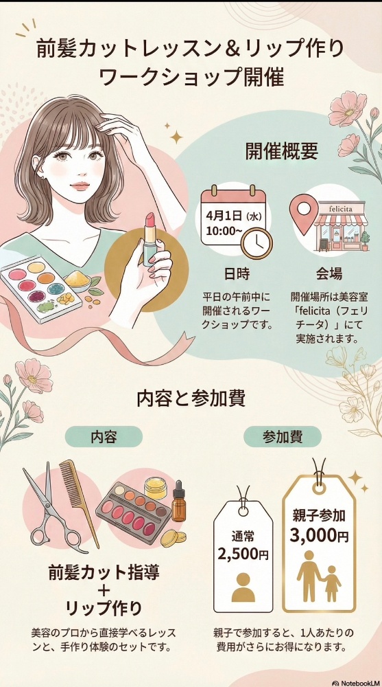 4月1日、15日水曜日にヘアサロンフェリチタにて、プロが教える!セルフ前髪カット講座、アロマリップ作り体験をさせていただきます♪